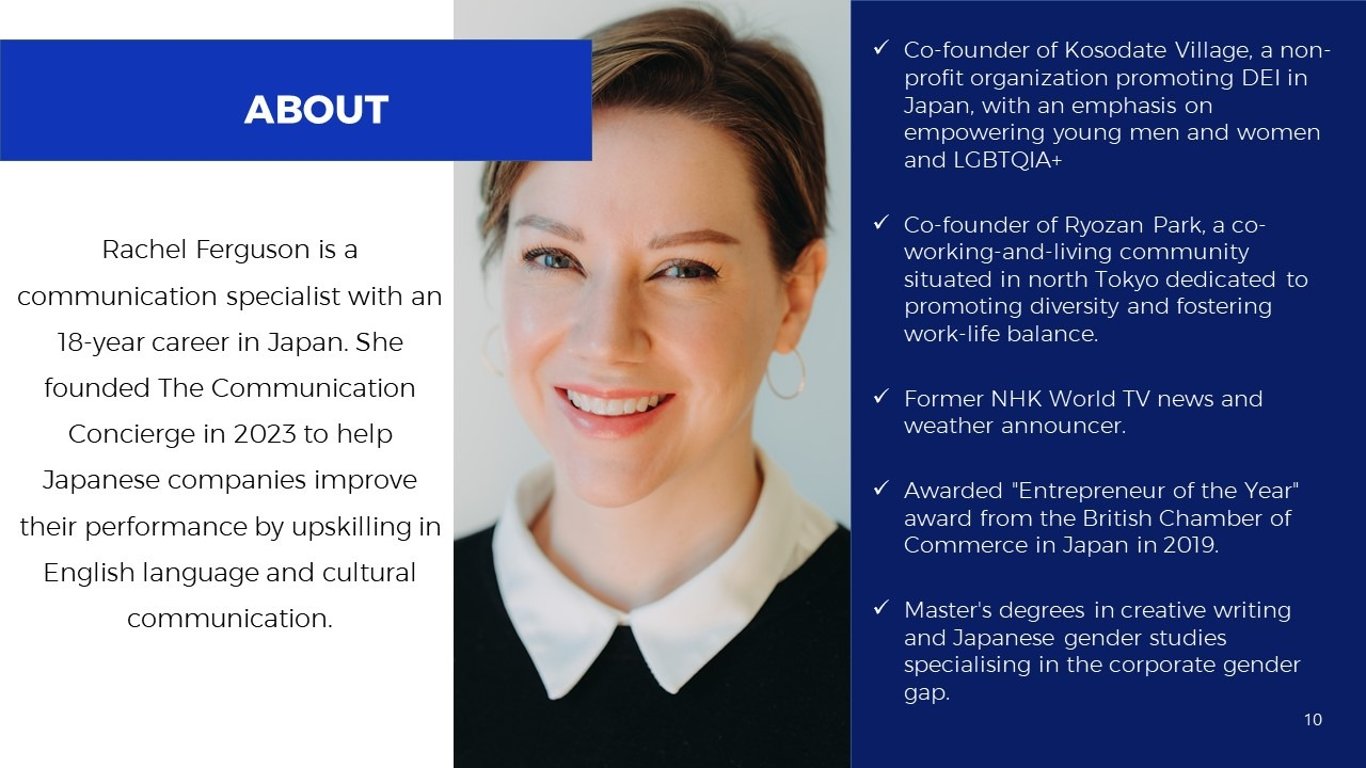 Rachel Ferguson is a communication specialist with an 18-year career in Japan. She founded The Communication Concierge in 2023 to help Japanese companies improve their performance by upskilling in English language and cultural communication.